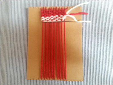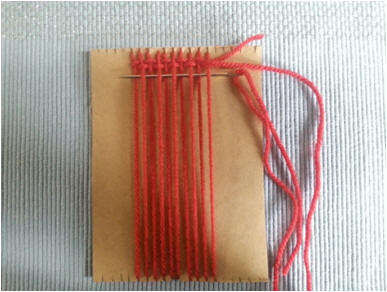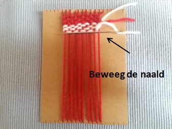 Rijg met een naald de draad door de gespannen draden. Ga daarbij onder de eerste draad door en daarna bovenlangs de tweede draad. Je gaat dus op en neer. Herhaal dit.