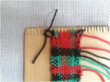 Door verschillende kleuren voor de inslag te gebruiken, krijg je een patroon met horizontale strepen. Knoop de nieuwe draad vast aan de oude.