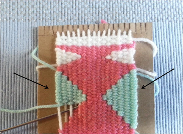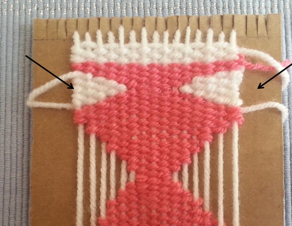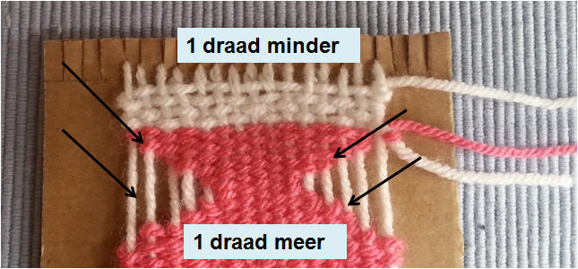 Na het roze gedeelte, kun je de witte stukjes gaan weven.