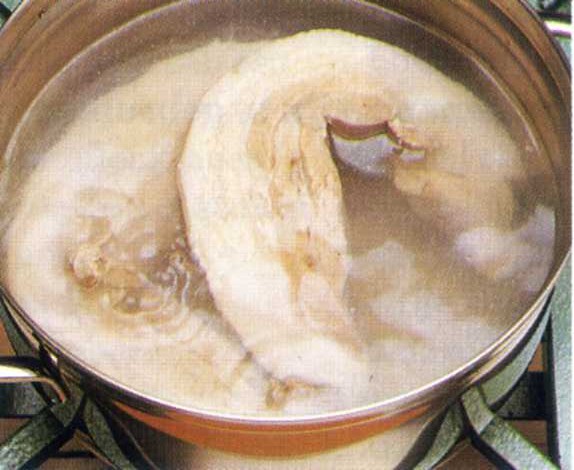 Het gaar maken van ingrediënten in kokend water of bouillon.