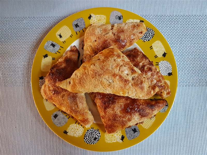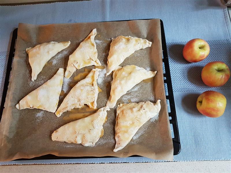 Leg op elk plakje bladerdeeg een eetlepel appelblokjes. Vouw de plakjes