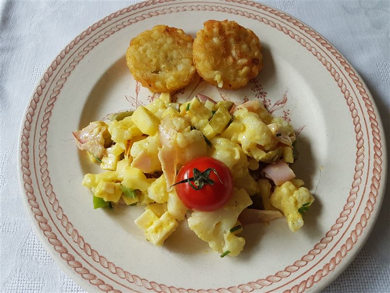 Snij de bloemkool in kleine roosjes en kook deze 10 minuten in kokend water. Giet af en laat de bloemkoolroosjes afkoelen