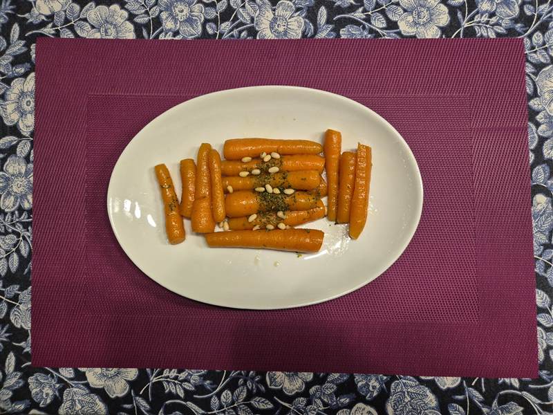 Serveer de worteltjes op een schaal met de pijnboompitjes en peterselie.