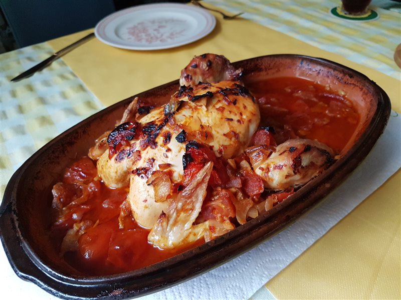 Doe de ontvelde kip in de Römertopf en schenk de saus over de kip.