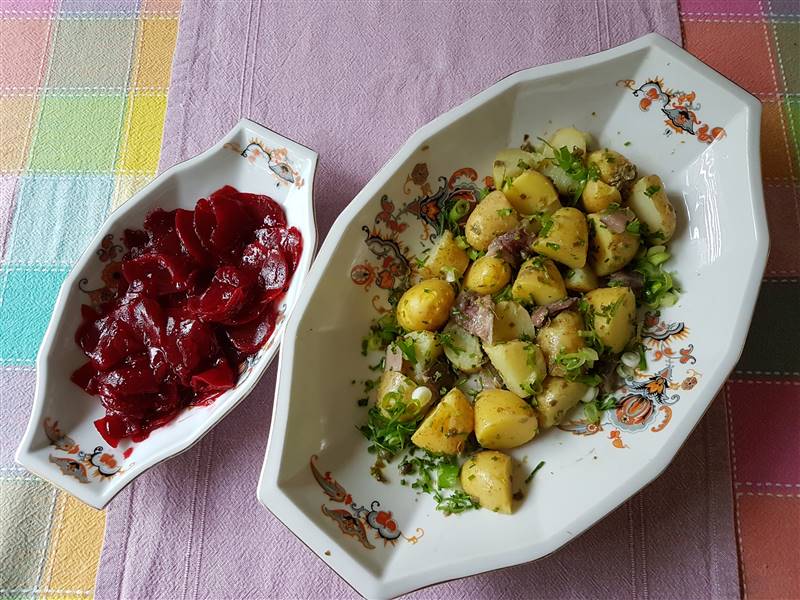 Doe de krieltjes in een schaal.Schep de dressing met de peterselie, bieslook en haring door