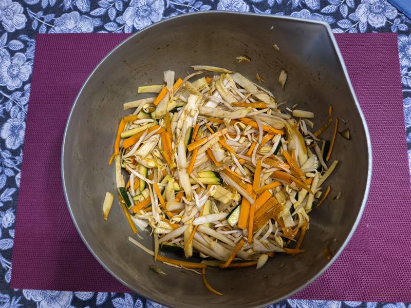 Doe de witlof, wortel, courgette en taugé in een schaal.