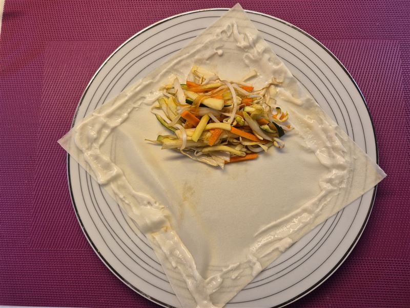 Leg een loempiavel op je werkblad of bord, met een punt naar beneden. Smeer het paje langs de randen. Doe wat van de vulling op het vel en vouw dit dicht met bovenste punt (afb.3). Rol dit op tot halverwege en vouw dan de zijkanten naar binnen (ab.4). Rol dan verder en plak het laatste stukje vast. Herhaal dit voor alle loempia's. Dek de loempia's af met plastic folie, zodat ze niet uitdrogen.