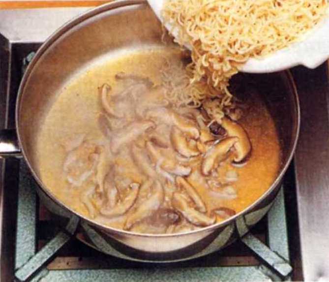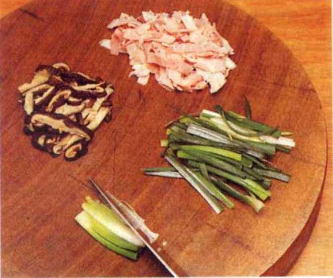 ham, lente-uien en geweekte paddenstoelen in reepjes.