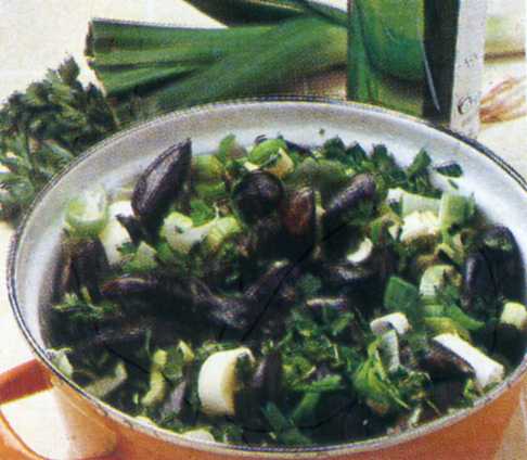 Mosselen met groenten, peterselie, laurier en wijn in grote pan opzetten. Breng ze op een matig vuur langzaam aan de kook en laat ze met het deksel op de pan onder geregeld omschudden in ca. 8 - 10 minuten op hoog vuur gaar worden. De mosselen moeten dan open staan. Dichte mosselen weggooien.