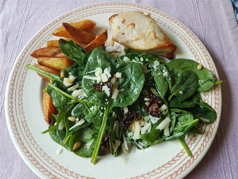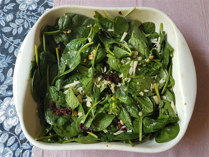 Meng de dressing door de spinazie en voeg de pijnboompitten,