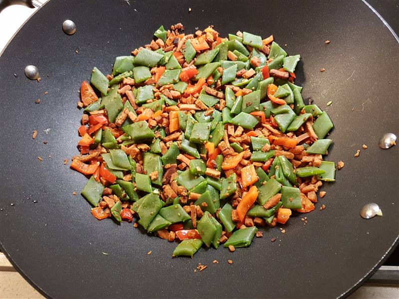 Meng de puree met de snijbonen en wokreepjes.