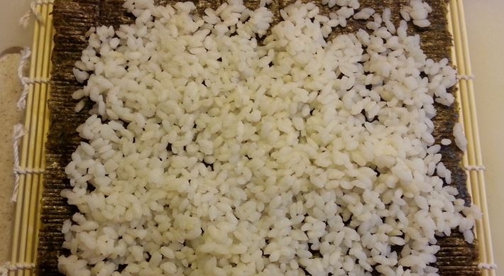 2. ¼ van de rijst in een dunne laag gelijkmatig op het blad nori uitspreiden. Aan de boven- en onderkant 1 cm leeg laten om de rol te kunnen sluiten, aan de zijkant tot de rand vullen.