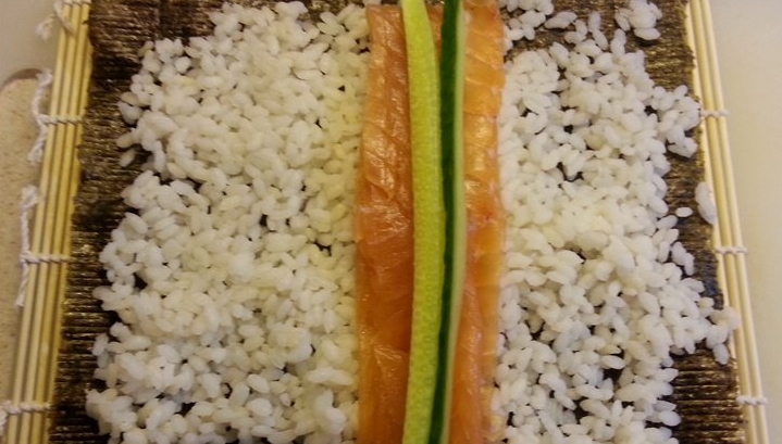 3. 3 repen zalm en 2 staafjes komkommer in het midden op de rijst leggen.