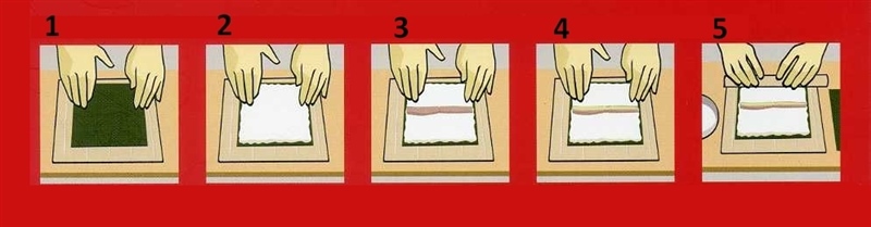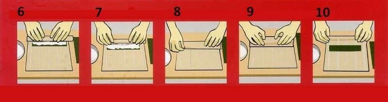 5-6-7. Nori zorgvuldig en gelijkmatig met behulp van bamboemat met lichte druk van het lichaam af oprollen.