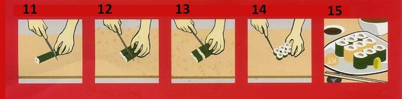 11. Sushirol met een scherp mes halveren. Mes voor elke snede met een beetje water nat maken om te voorkomen dat de rijst er aanplakt.