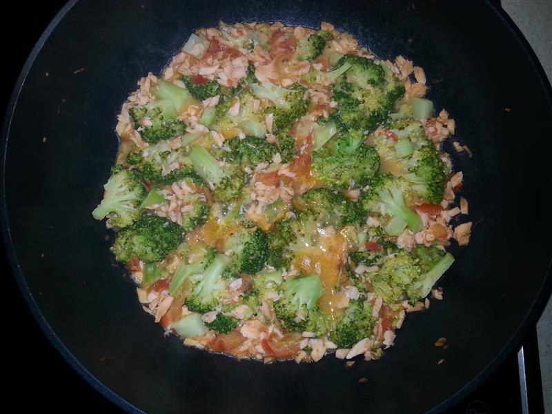 Voeg de broccoli toe en laten even meebakken. Doe er het