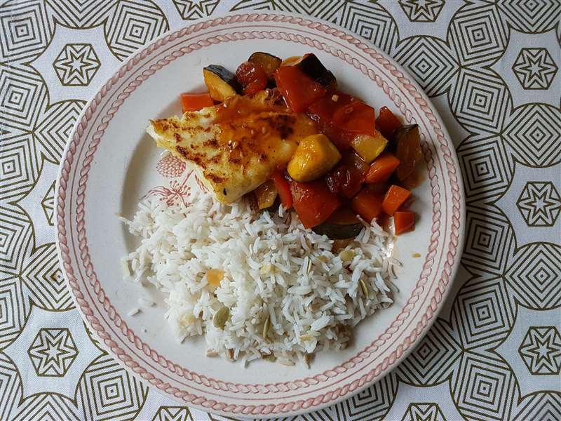 Verhit 1 eetlepel olie in de wok en bak de vis aan beide zijden 3 minuten gaar en bruin.