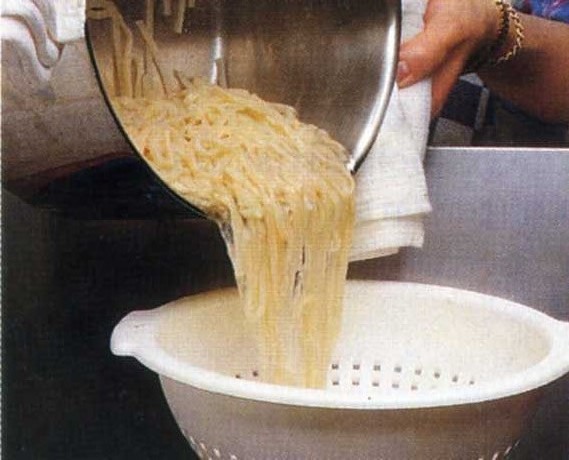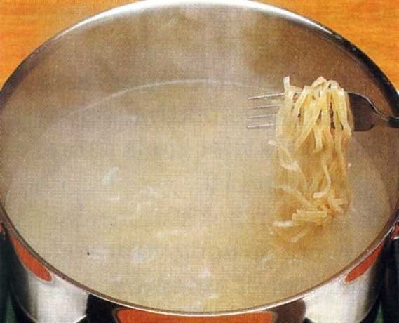 Verse mie moet voor het bereiden 10 minuten in warm water liggen om de overtollige bloem eraf te spoelen.