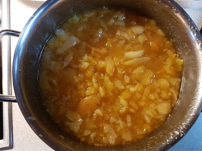 Doe ze met een beetje van het vocht in een schaal en pureer ze voor jam heel fijn en laat voor confituur de stukjes wat groter. Voeg de rest van het weekvocht, de geleisuiker en het citroensap toe en meng alles door goed door elkaar.