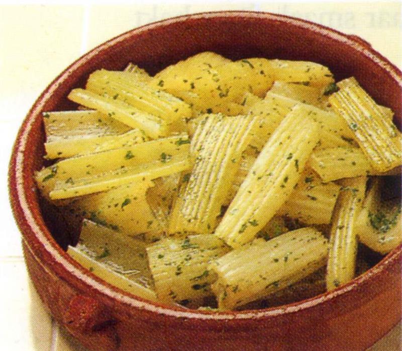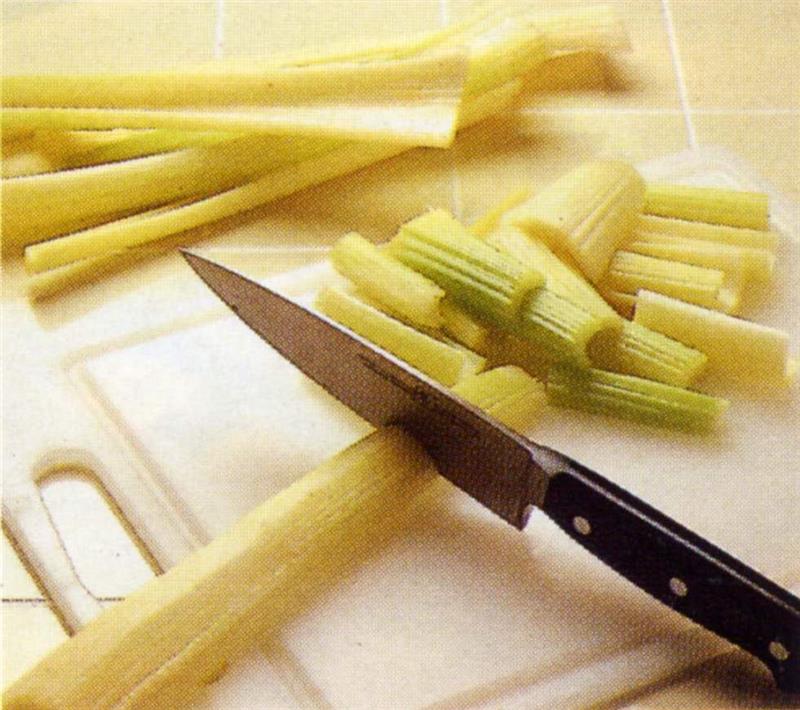 Verwijder de stronk van de bleekselderij (700 gram schoongemaakt) en het blad. Trek met een dunschiller de harde draden van de stelen en was de bleekselderij.