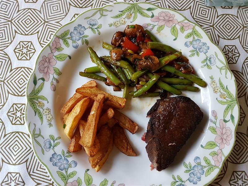 Lekker met ossenhaas of varkenshaas en eigen gebakken frites.
