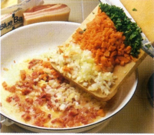 mengsel van fijngesneden groenten, verse kruiden en eventueel spek (mirepoix).