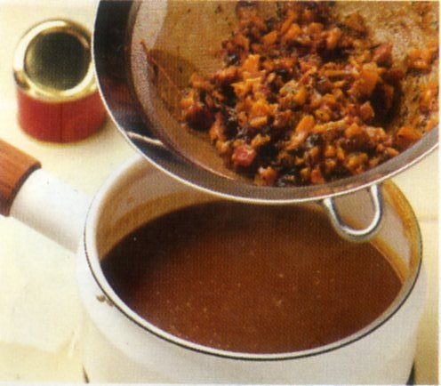 braadjus en tomatenpuree zorgt mede voor de donkere kleur.