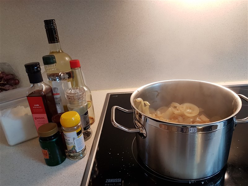 Snijd de uien in schijven en fruit deze in een grote pan, op een matig vuur, in de olijfolie samen met de suiker, laurierblad, kruidnagels, rozemarijn en peper in 5 minuten goudbruin.
