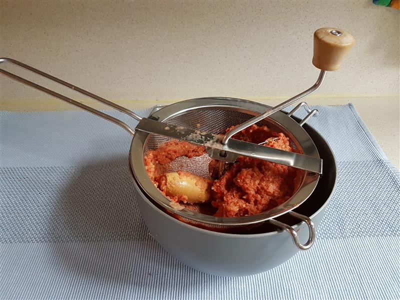 Wrijf het groentenmengsel boven een kom door een zeef of gebruik een
