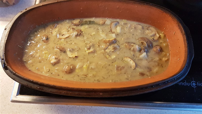 Haal de Römertopf uit de oven en roer eventueel de Alpro door het vocht.