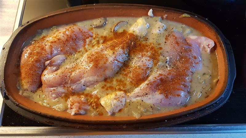 Doe het mengsel in de Römertopf. Leg de ontvelde kip er boven en
