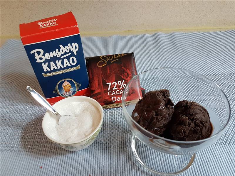 Lekker ijs, het smaakt heel erg naar pure chocolade. Als je daar niet van houdt, kun je gewone pure chocolade gebruiken, i.p.v. de sterke 72% cacao of een recept met melk toevoegen proberen, zie hieronder.