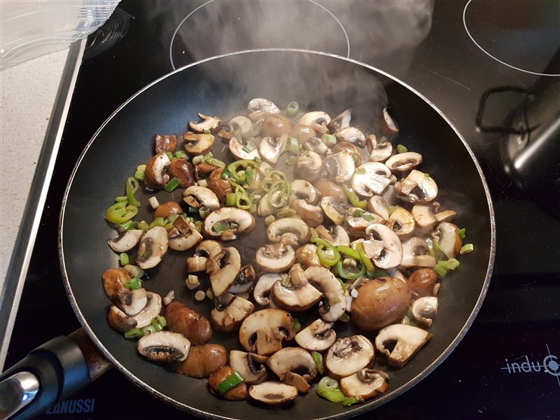 grote brede, koekenpan. Doe de champignons er bij en verspreid