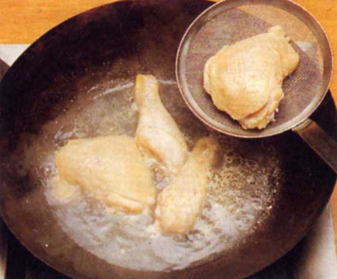 maïzena en gehakte gember. Leg de kip hierin en laat 30 minuten staan.