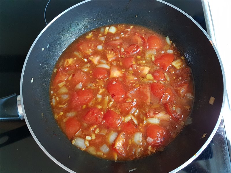 totdat de ui glanzend is. Bak de tomaten even mee.