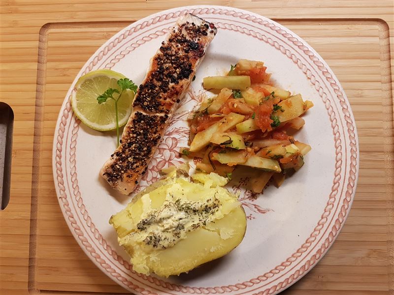 Lekker met gegrilde zalm en gepofte aardappel.