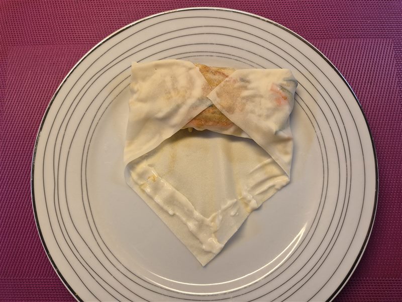 Leg een loempiavel op je werkblad of bord, met een punt naar beneden. Smeer het paje langs de randen. Doe wat van de vulling op het vel en vouw dit dicht met bovenste punt (afb.3). Rol dit op tot halverwege en vouw dan de zijkanten naar binnen (ab.4). Rol dan verder en plak het laatste stukje vast. Herhaal dit voor alle loempia's. Dek de loempia's af met plastic folie, zodat ze niet uitdrogen.
