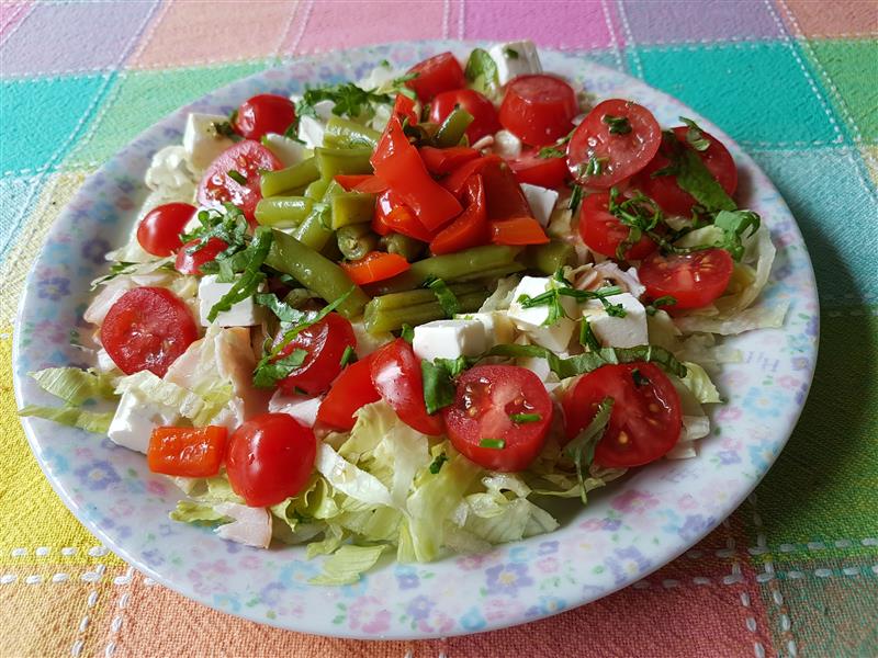 De salade heeft als basis sla met tomaat, soms komkommer, enkele