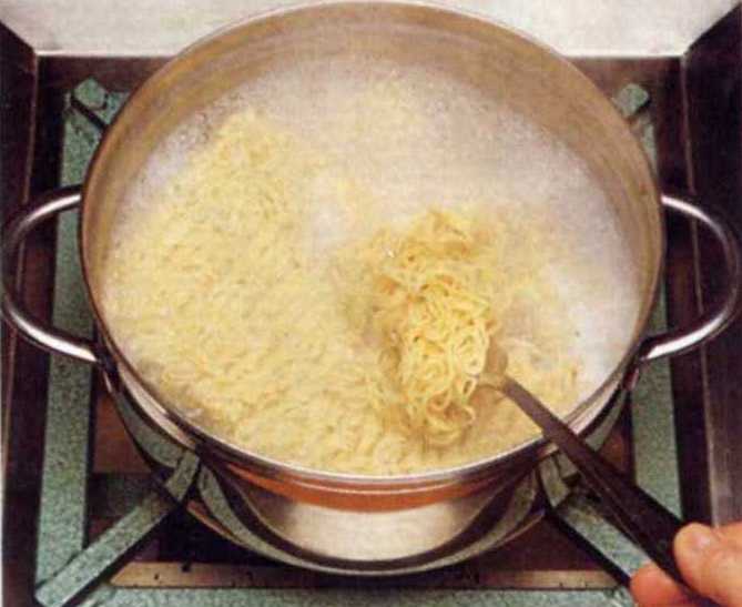 ham, lente-uien en geweekte paddenstoelen in reepjes.
