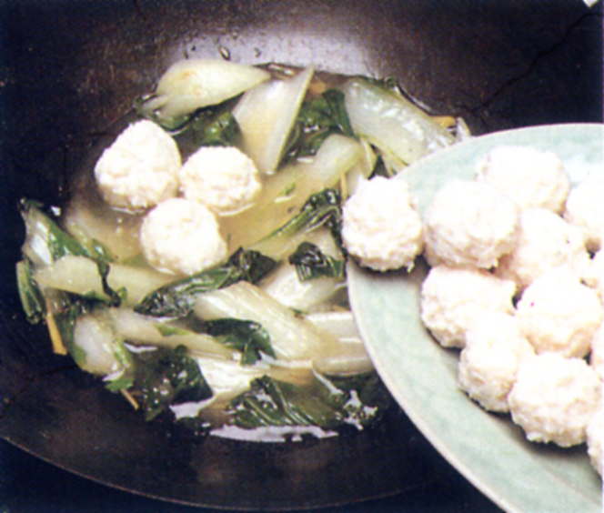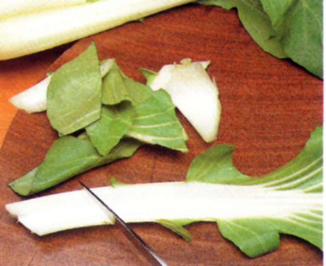 Sausje:3. Snijd de gember in dunne reepjes. Was de paksoi en verwijder de lelijke bladeren. Snijd de paksoi in stukken, blancheer ze in kokend water, spoel met koud water af en laat ze uitlekken.