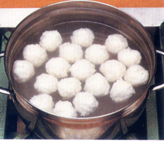 2. Breng in een ruime pan water aan de kook. Voeg de visballetjes toe, zet het vuur laag, pocheer de balletjes in ca. 3 minuten tot ze boven komen drijven en schep ze uit het vocht