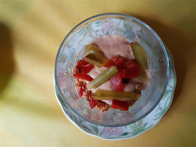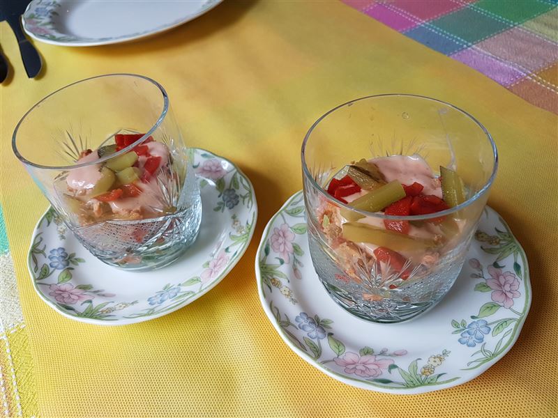 Leg op de bodem van de serveerschaaltjes de helft van de sla en schep daar de helft van het zalmmengsel op. Herhaal dit. Giet er daarna de whiskeysaus over.Garneer met de overgebleven paprika en augurk.