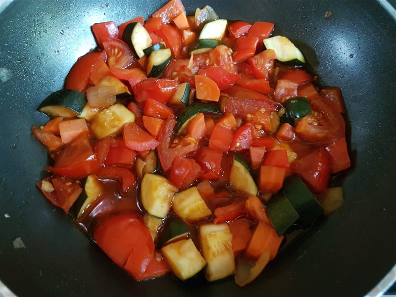 Doe de paprika en courgette er bij en laat nog even fruiten.